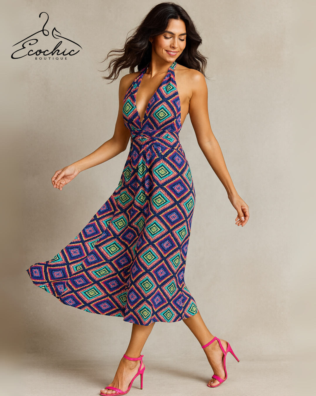 • Cor/Estampa: Geométrica multicolorida vibrante